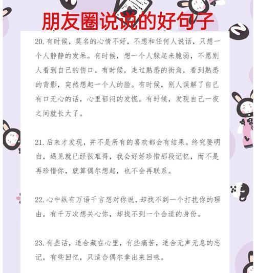 微信朋友圈,是一个可以表达自己生活的平台。有时,我们用语言无法表达的情感和感受,都可以在这里找到它们的呼应。今天,我要与大家分享一些关于微信朋友圈的好句子,让我们在表达自己的同时,也给生活加点美。